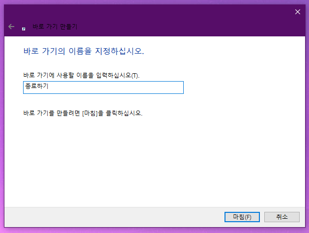 3. 바로가기 아이콘의 이름을 정해서 입력해 주시면 됩니다. 종료하기로 입력하겠습니다. 그리고 마침 클릭합니다.